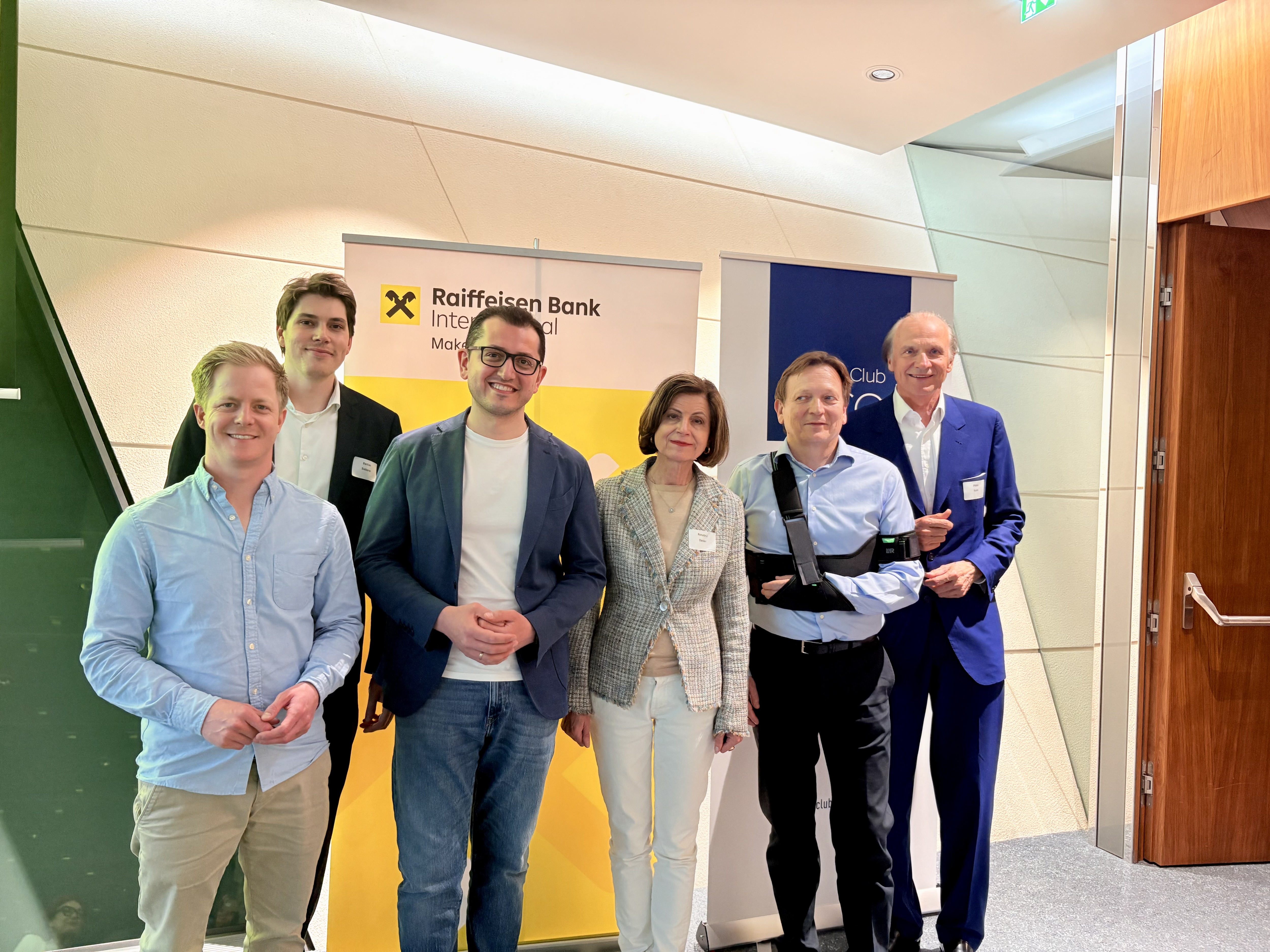 v.l.: Matthias Fleischmann (RBI - Compliance Data Architecture & Reporting), Organisator der Veranstaltung Bastian Sieberer (RBI, NextGen-Arbeitsgruppe Club Tirol) Ilgar Beniaminov (RBI - Fraud Transaction Monitoring), Club Tirol Vizepräsidentin Renate Danler (Renate Danler Consulting), Andreas Gschwenter, Vorstand (CIO/COO) der Raiffeisen Bank International und Club Tirol-Vorstandsmitglied Peter Kunz